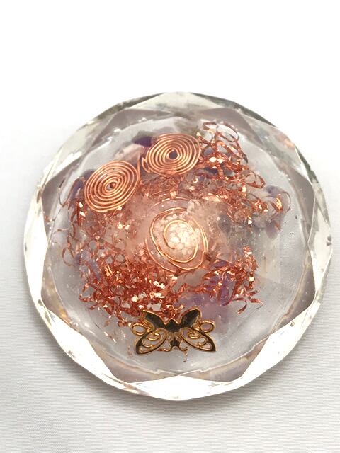 オルゴナイトとは、ネガティブなオルゴンエネルギーを吸収し、ポジティブなオルゴンエネルギーに変換して放出し続けると言われる、オルゴンエネルギーの循環・発生装置です。構造としては、金属片と水晶などのパワーストーンを、樹脂で固めたものです。